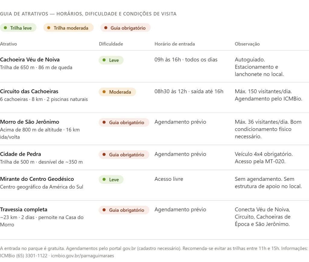 A entrada no Parque Nacional da Chapada dos Guimarães é gratuita. O agendamento de alguns atrativos, como o Circuito das Cachoeiras, é feito pelo portal gov.br.